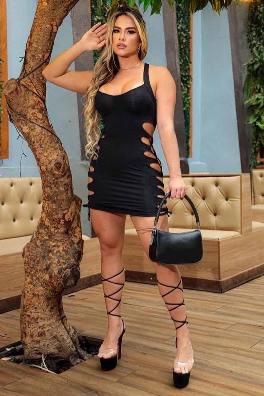 Features: Short black tube-style dress with a crossover back and side braided openings.