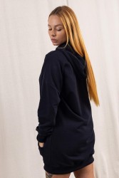 Step up your fashion game with this edgy and versatile hoodie-like dress in sleek black. It's the perfect blend of comfort and style, combining the relaxed vibe of a hoodie with the chicness of a dress. The dress features long sleeves to keep you cozy and a small rubbery label on the front, adding a cool and contemporary touch.