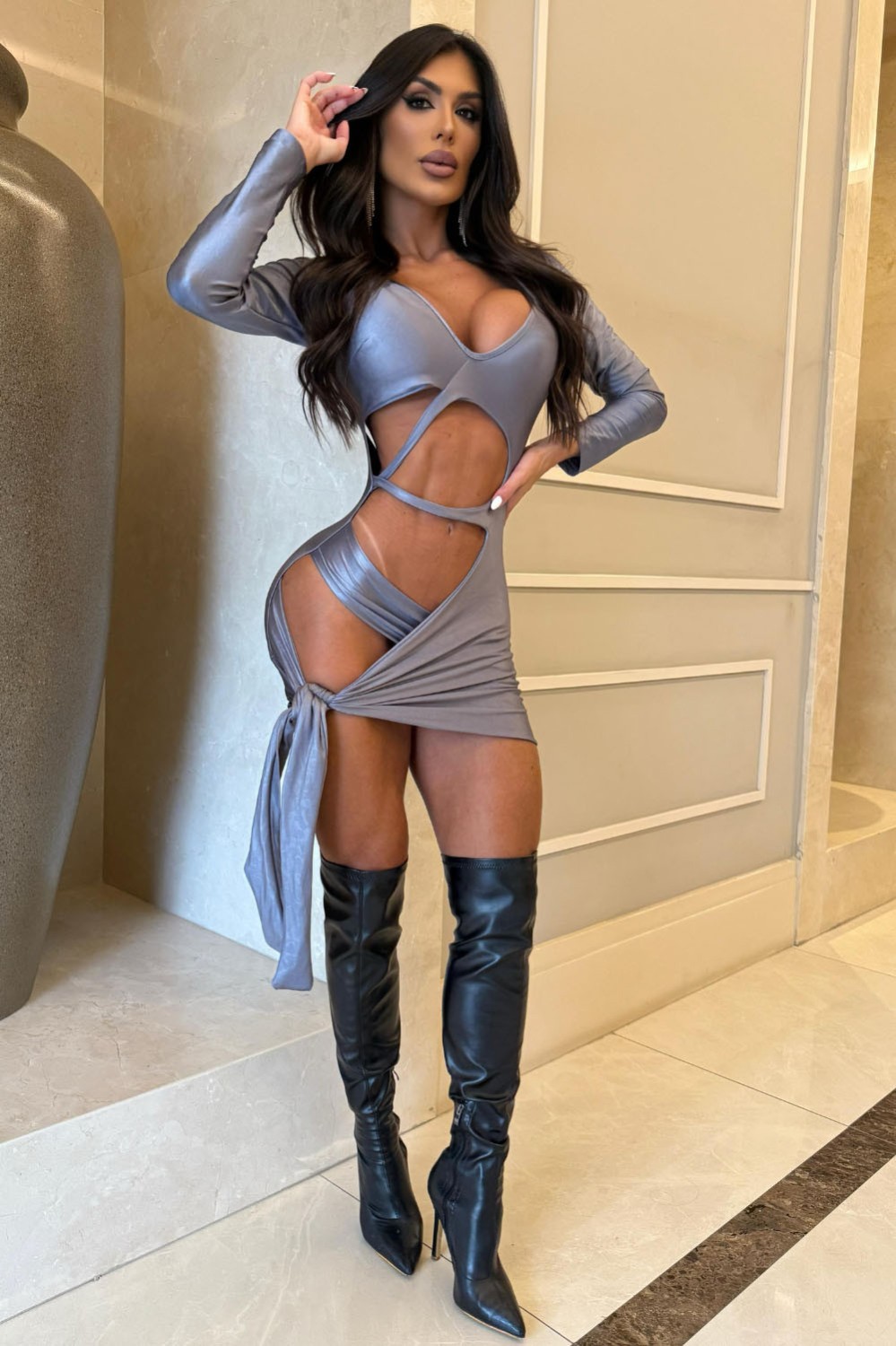 The "Feline Power" dress is a true fashion statement for bold and confident women. With strategic cutouts, side ties and long sleeves, it highlights curves with sensuality and elegance. The fabric with a slight shine and embossed animal print adds a sophisticated and wild touch, perfect for impactful nights. Pair it with over-the-knee boots and get ready to dominate everyone's looks!