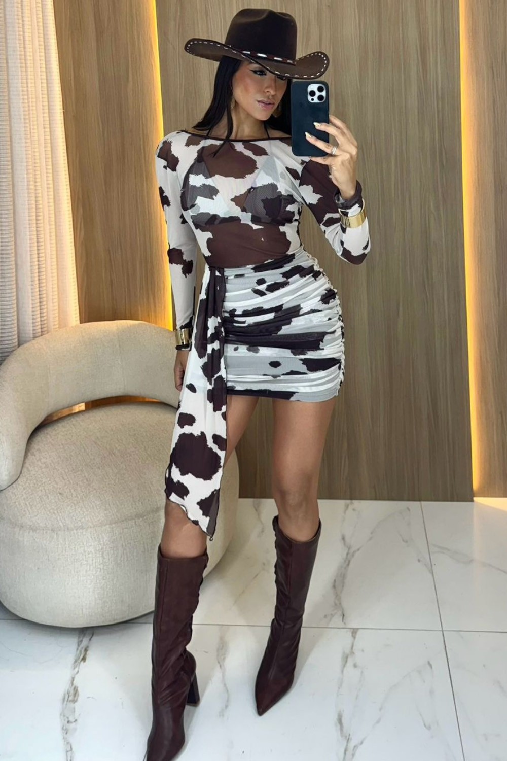 The dress is short, fitted to the body, with a black and white cow print. It has long sleeves in transparent fabric, a discreet front neckline and a completely open back, with thin ties. The piece has a side detail with a draped band, creating movement. It comes with a top with cups.