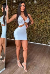 Short dress with a fitted silhouette, featuring front and side cutouts that flatter the figure. The bust has beading in a wavy design, adding sparkle and sophistication. A modern and striking piece for evening looks.