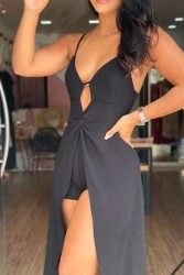 Features: Fly jumpsuit with adjustable straps and elastic on the back. With long skirt detail open at the front showing the shorts.