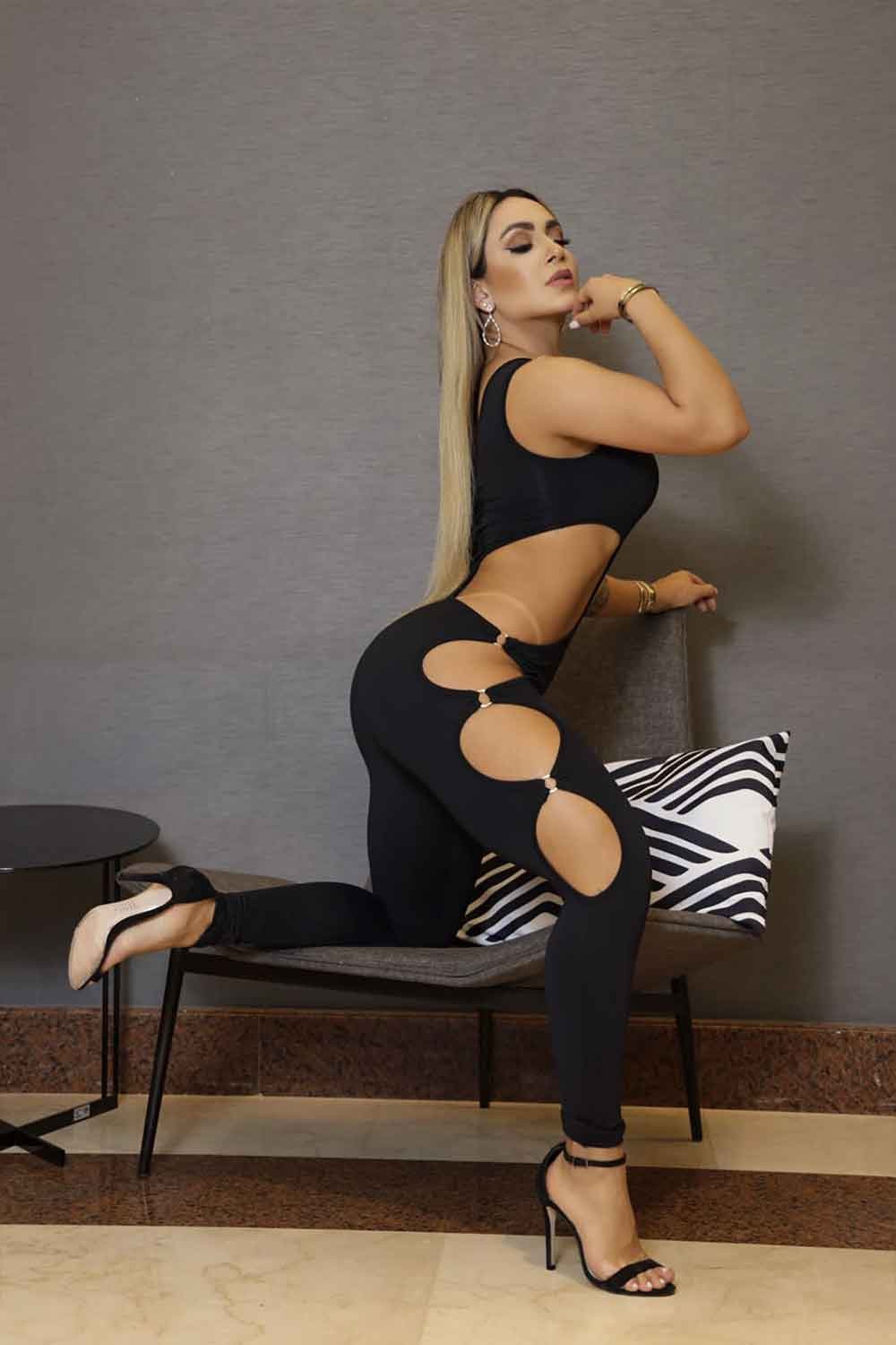 Features: Long jumpsuit with single strap, cutouts on the sides with hoop details.