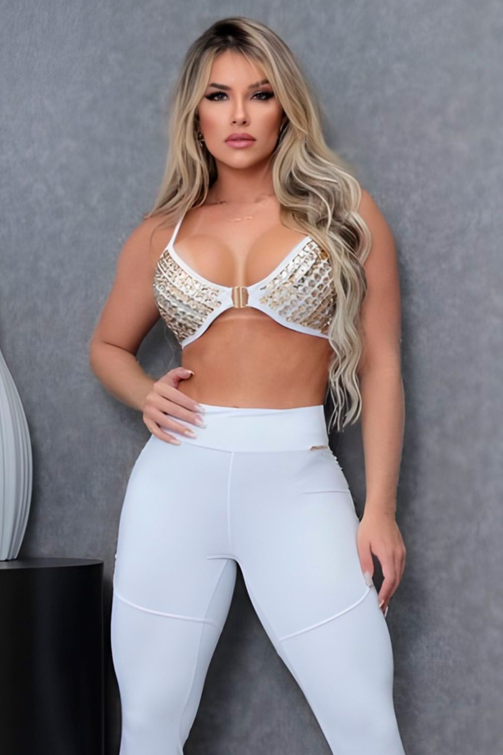 Women's set in white compression fabric, featuring a fitted top and high-waisted leggings with a butt-lifting effect. The design enhances the silhouette and offers comfort and freedom of movement. Perfect for workouts, sports activities, or stylish casual outfits.