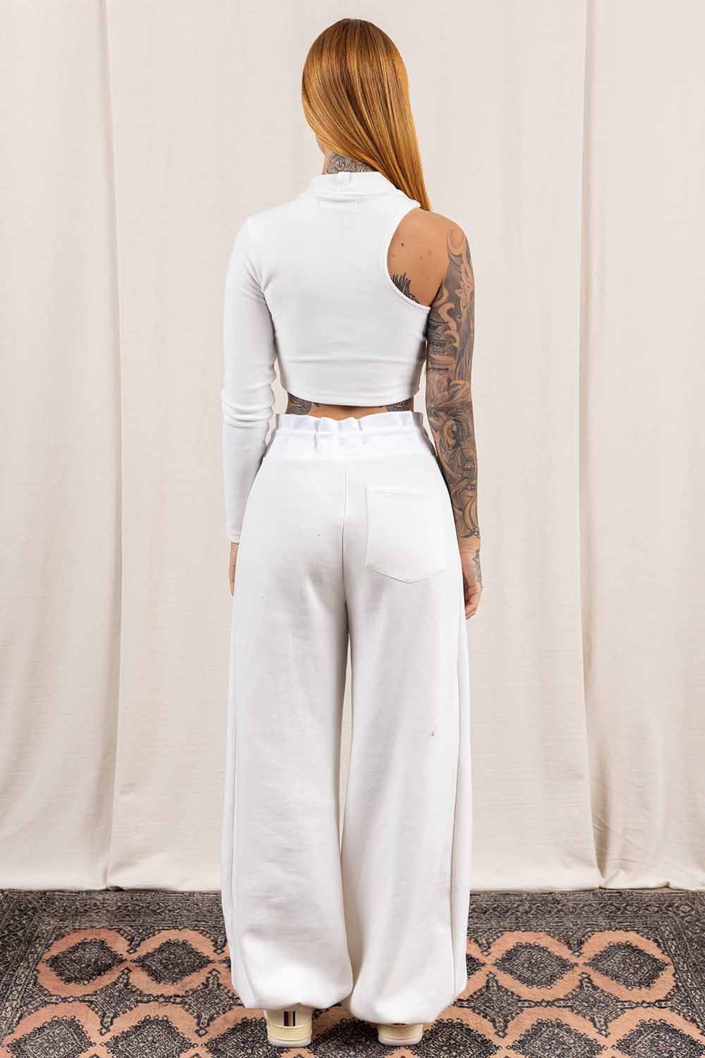 Features: White cropped long sleeve. Right shoulder showing. Velvety fabric. No bulge. It has lining.