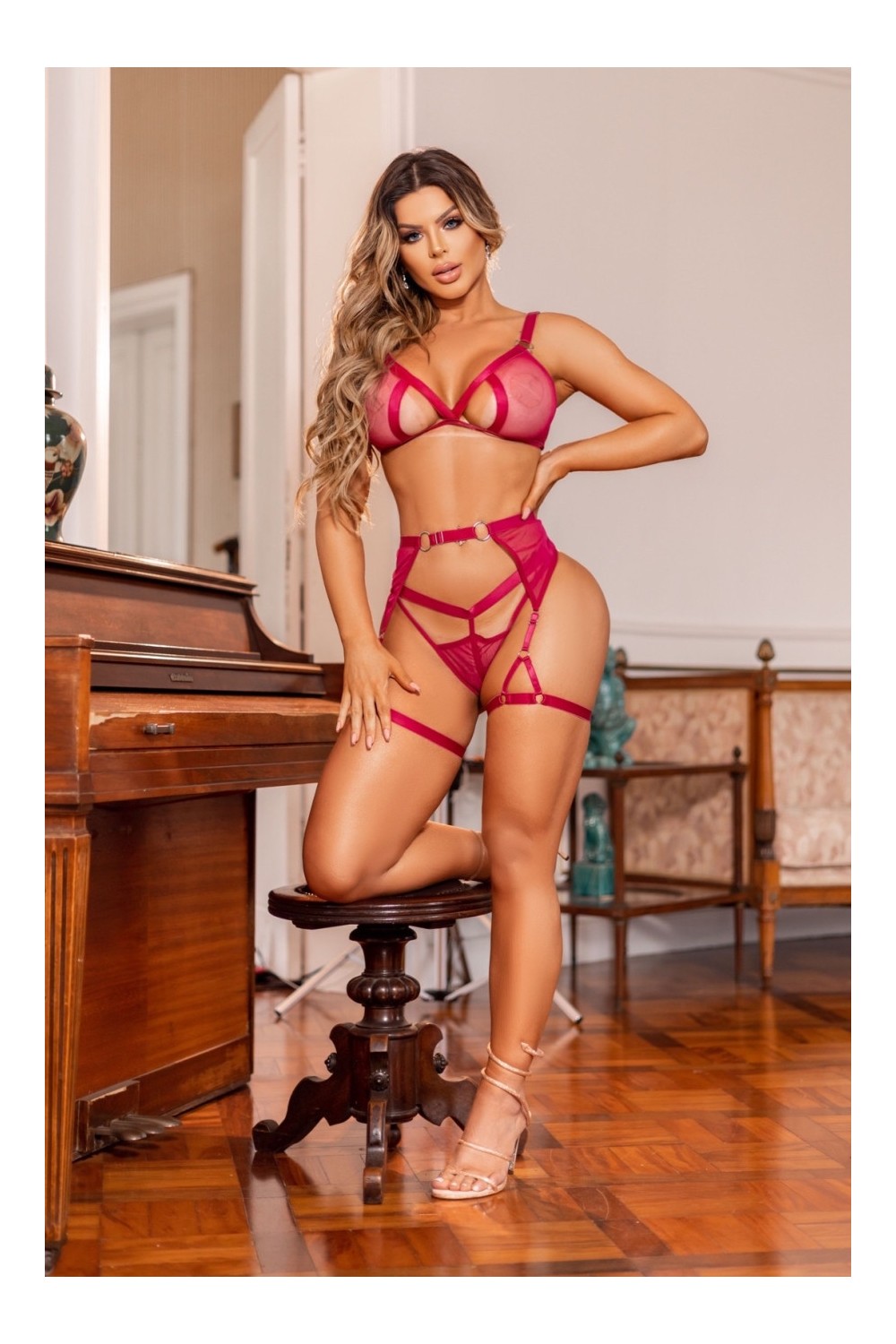 Features: Set without cups, without rim, tulle bust with cutout, wire panties also with cutout and strappy detail, accompanies garter belt with details of rings and straps,