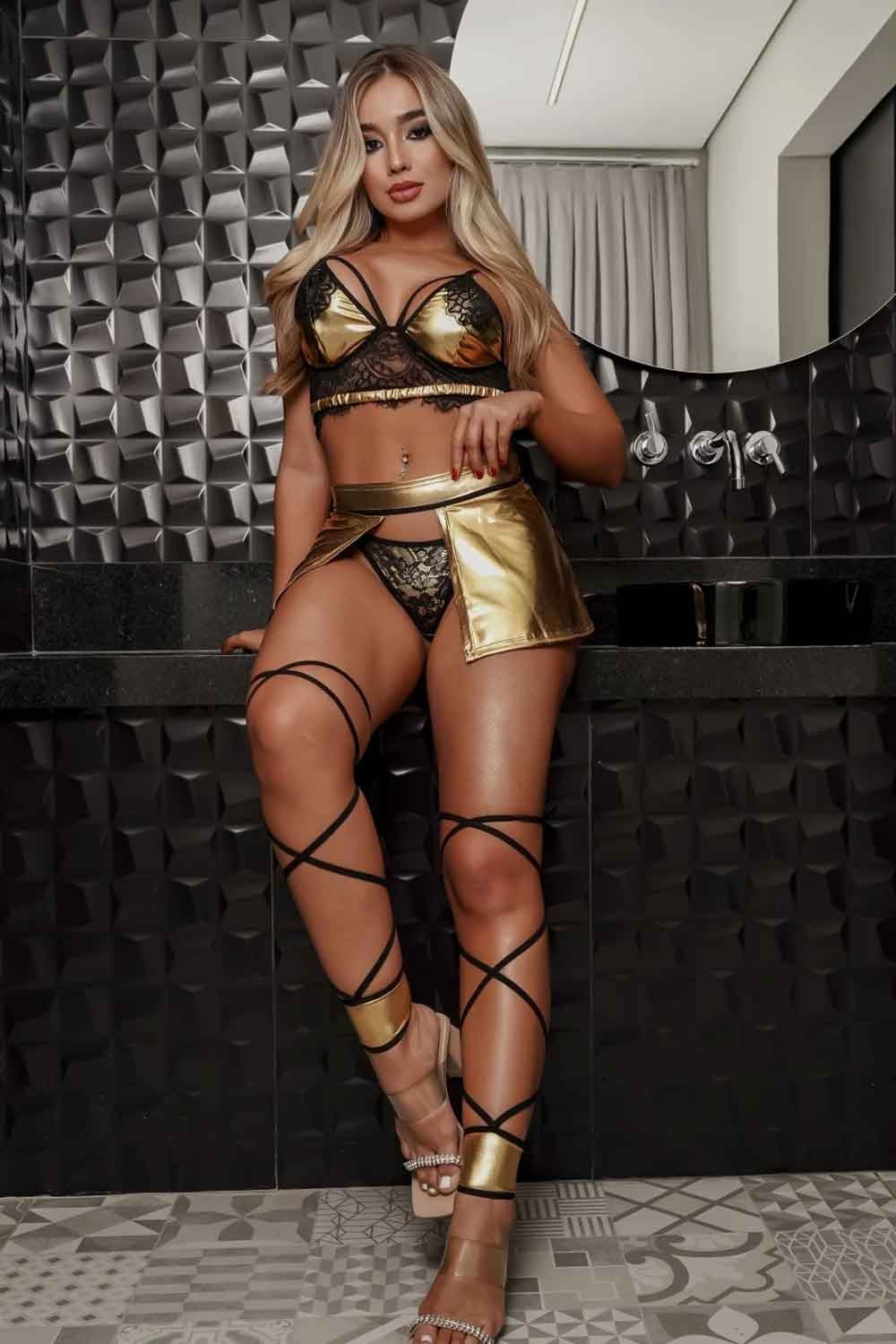 Features: It is a piece inspired by Queen Cleopatra, all in Lamê fabric, with a lace base composed of a detail with golden elastic and also has a strappy on the bust. The panties are model thong, with strappy braided straps, which enhances the female body even more, accompanying a skirt inspired by Ancient Egypt, also including the braided persexy to further highlight the piece. Inclued Bra + Panties + Skirt + Persexy pair.
