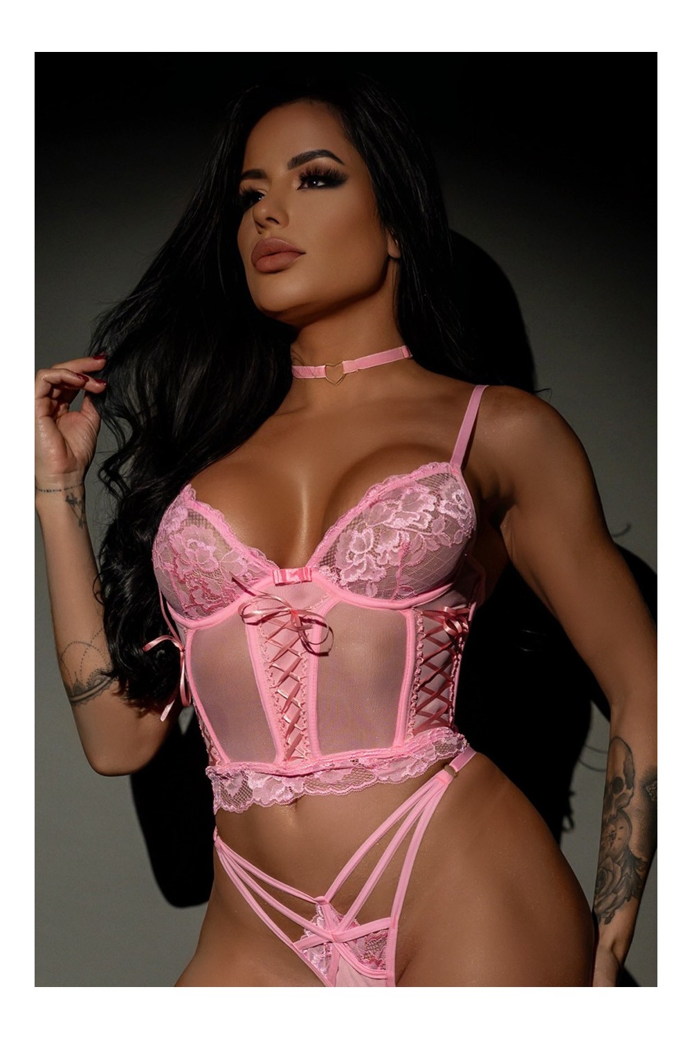 Imagine yourself wrapped in a tulle and lace crop top, with satin ribbon details, accompanied by string panties, both with adjustments. It's the sexy lingerie you need to feel confident and irresistible.