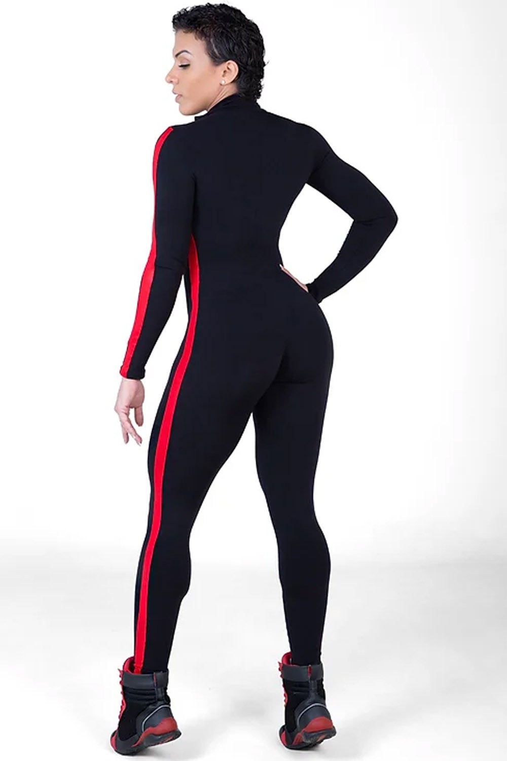 Features: Black fitness jumpsuit with zipper detailing and red bands over the piece. Antibacterial fabric, high breathability and UV protection.