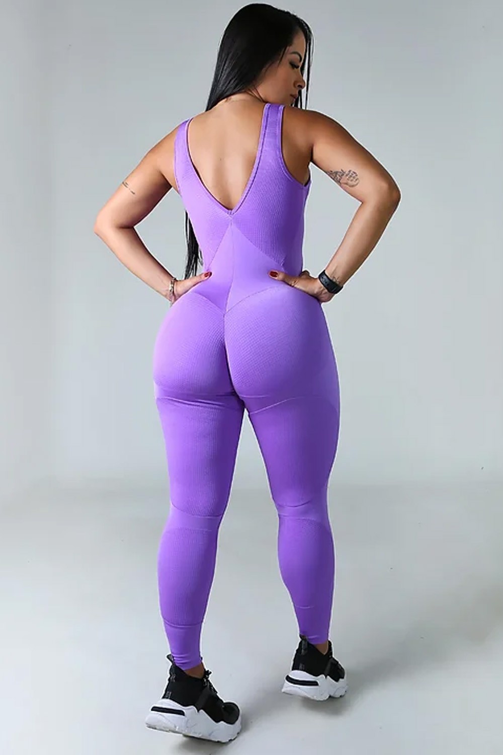 Features: Sleeveless fitness jumpsuit, made in violet purple with textured details on the bust and front of the piece.