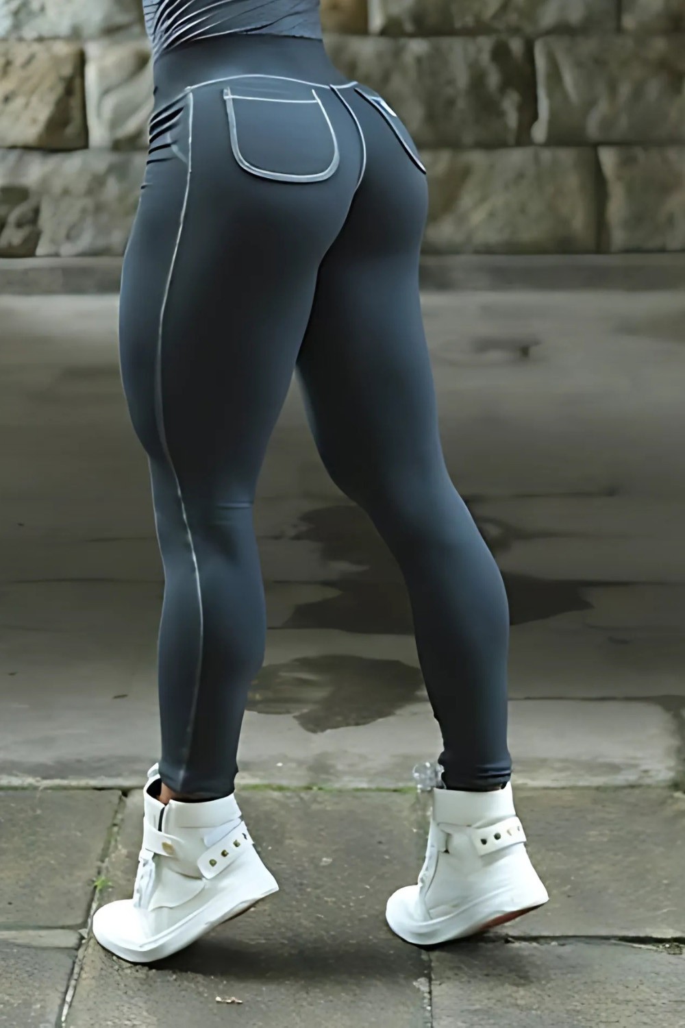 These high-waisted gray leggings are designed to offer comfort and style. They feature details that simulate pockets on the back, giving a casual and modern touch, and strategically positioned seams that help to enhance the silhouette. Made of flexible and fitted fabric.
