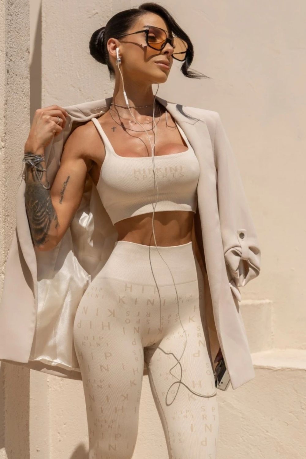 Beige leggings with a subtle letter print, a high-waisted waistband, and high-compression fabric. Ideal for workouts and casual outfits, they combine comfort and minimalist style.