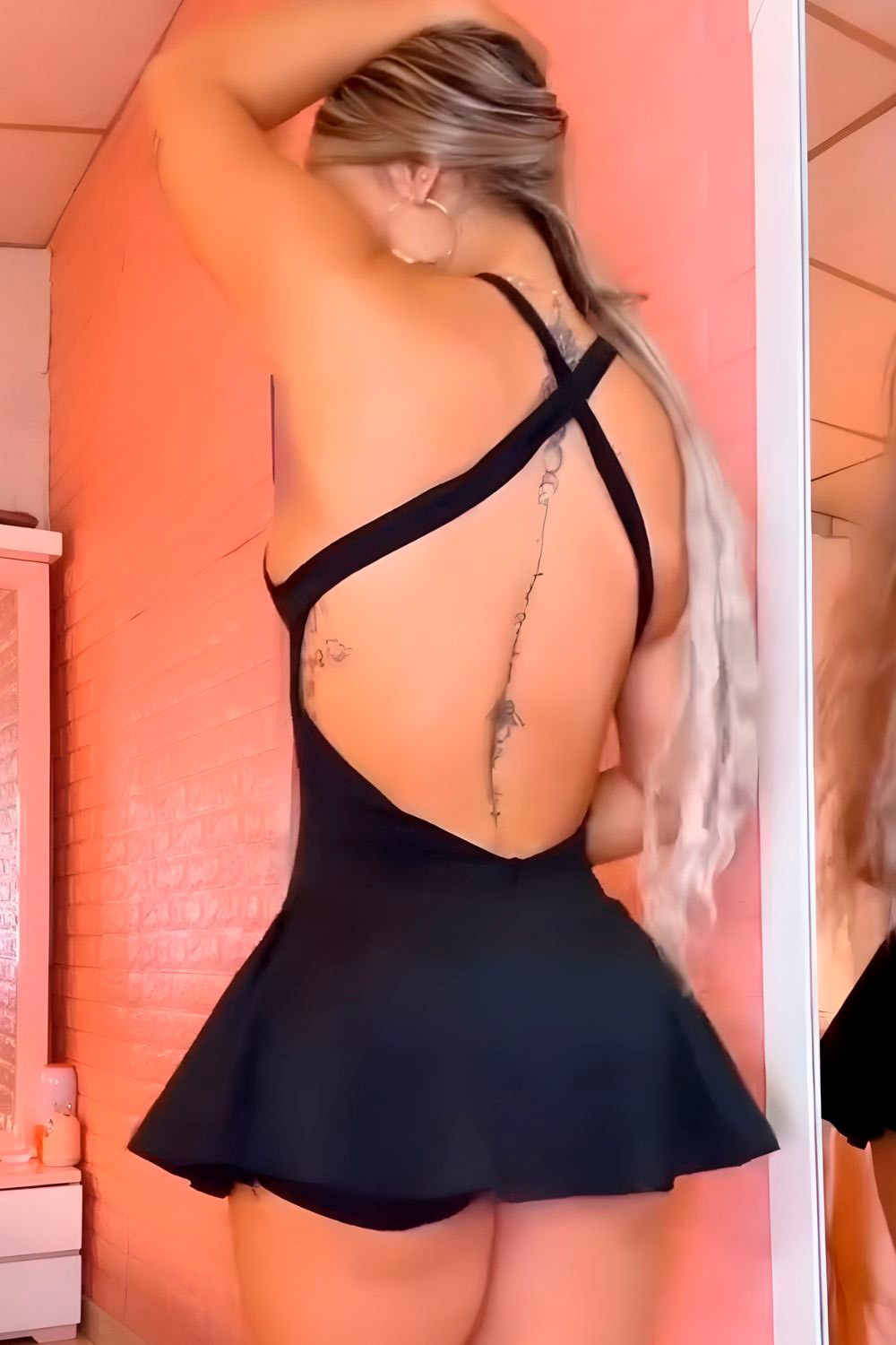 Black romper with a fitted silhouette and overlay skirt, elegantly flattering the figure. Features a halter neckline and open back with crossed straps, giving it a modern and sensual touch. Made from lightweight and comfortable fabric, it's ideal for casual occasions or nights out. Perfect for stylish and confident workouts.