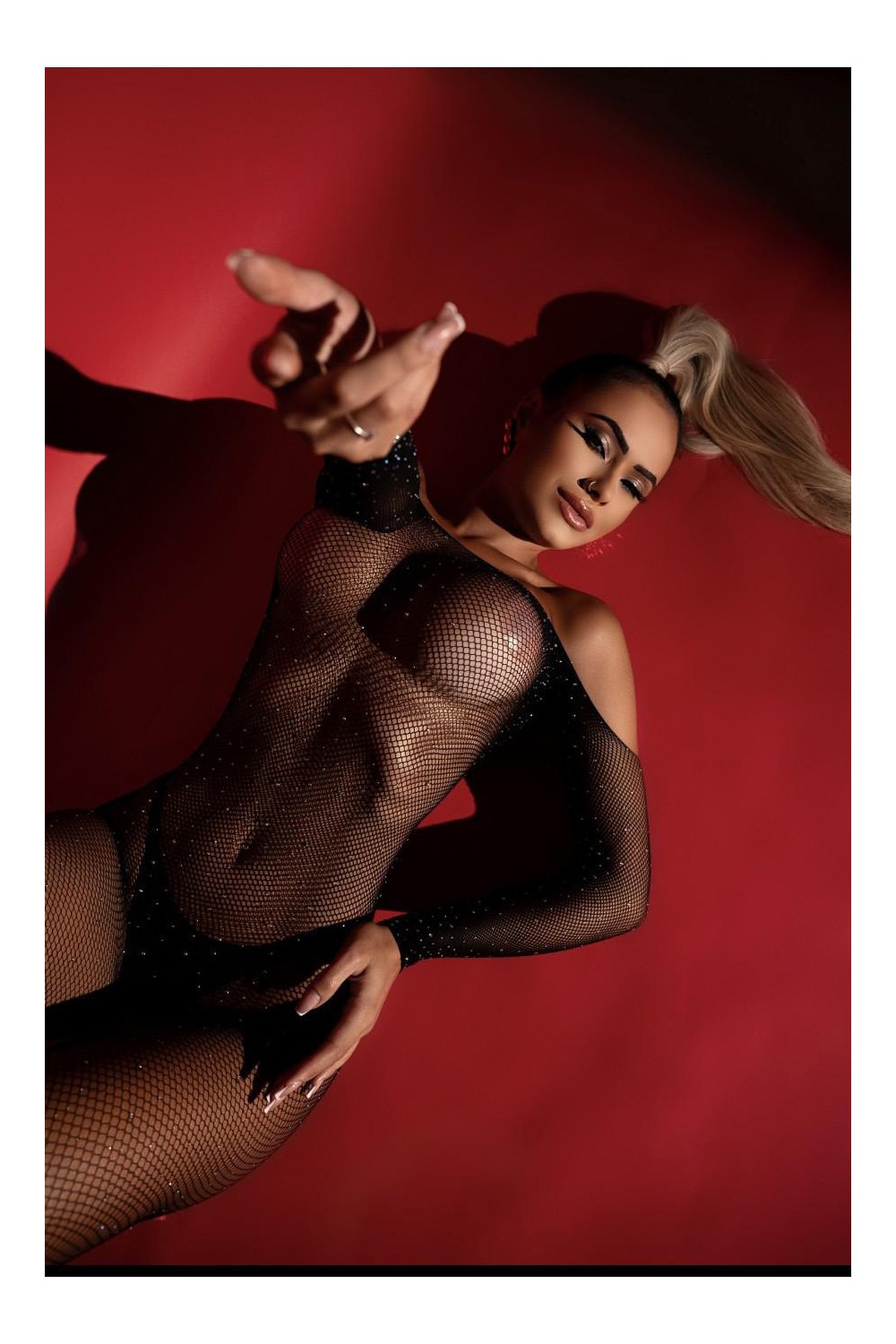 Jumpsuit in transparent tulle with microcrystal appliqués, full modeling and long sleeves. The piece combines sensuality and shine in the right measure, with an off-the-shoulder neckline and strategic cutouts that enhance curves. Ideal for nighttime occasions or bold looks with attitude.