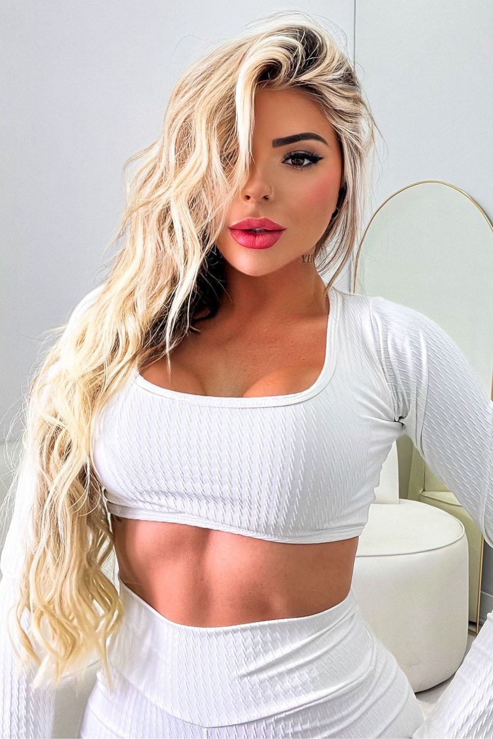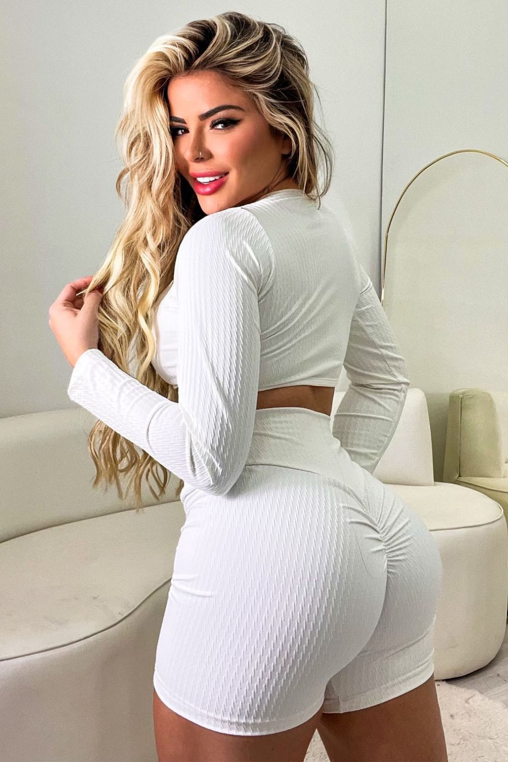 Long-sleeved cropped top in white ribbed fabric with a light texture. It has a square neckline that enhances the bust and a body-hugging design. Comfortable and stylish, it is ideal for those seeking a clean, elegant and versatile look, both for training and for lifestyle. White ribbed shorts with a high waist, with anatomical cut and a ruffled detail on the butt that enhances the silhouette. The short length provides freedom of movement and the fabric with light compression ensures safety and comfort.