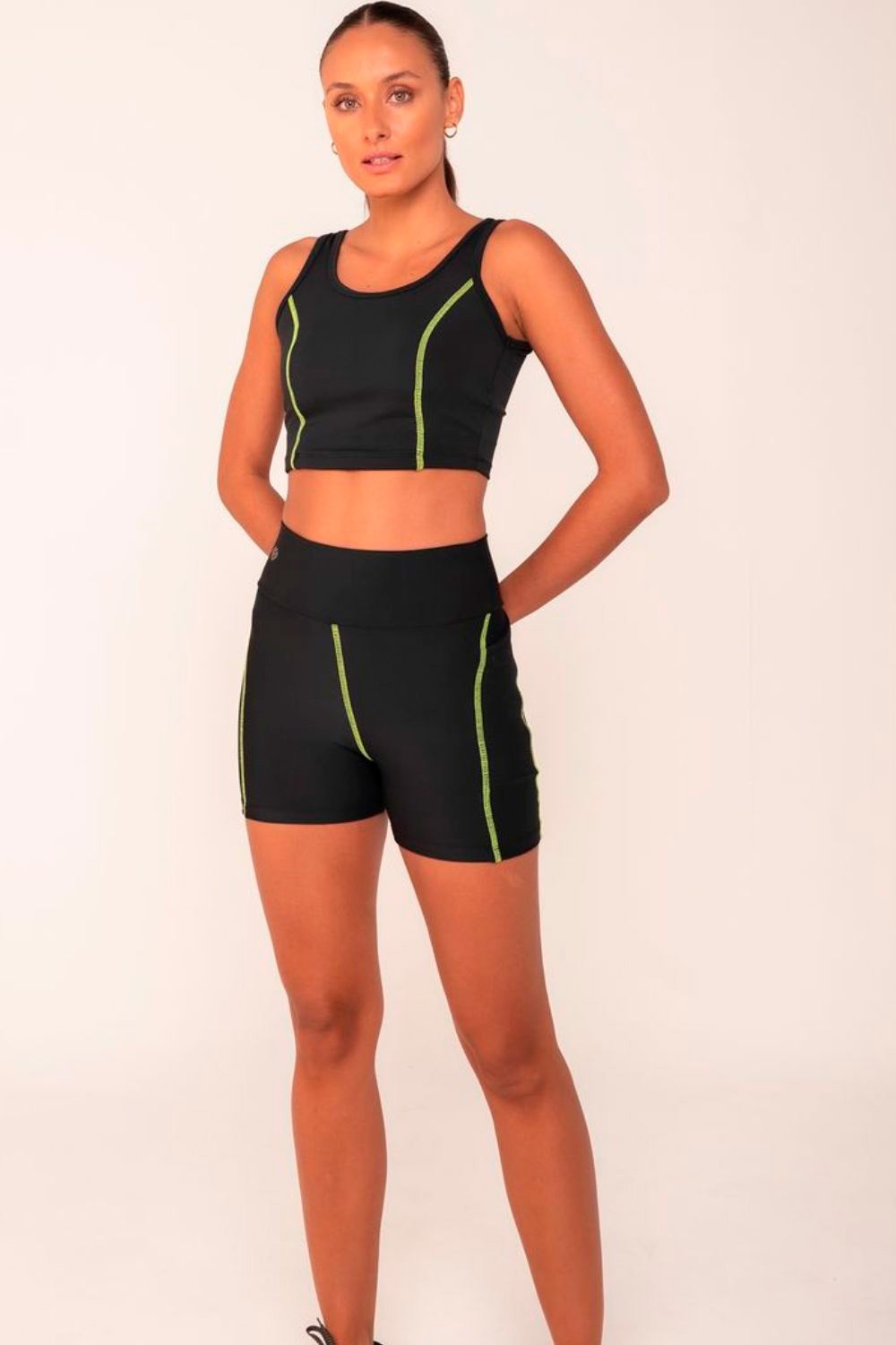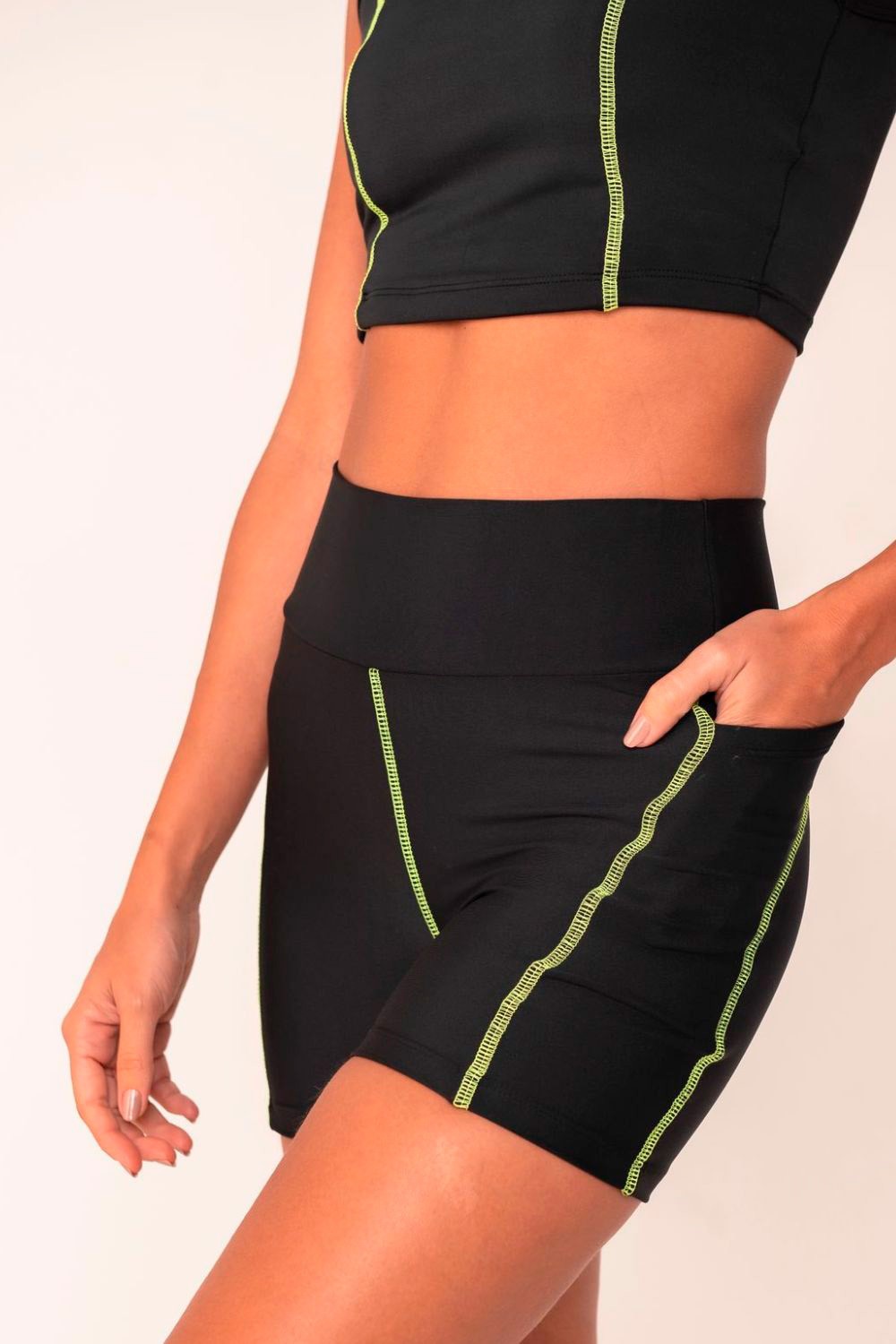 Fitness shorts made from high-performance fabric, with a high waist for support and contrasting stitching for a flattering silhouette. Ideal for stylish and comfortable workouts.