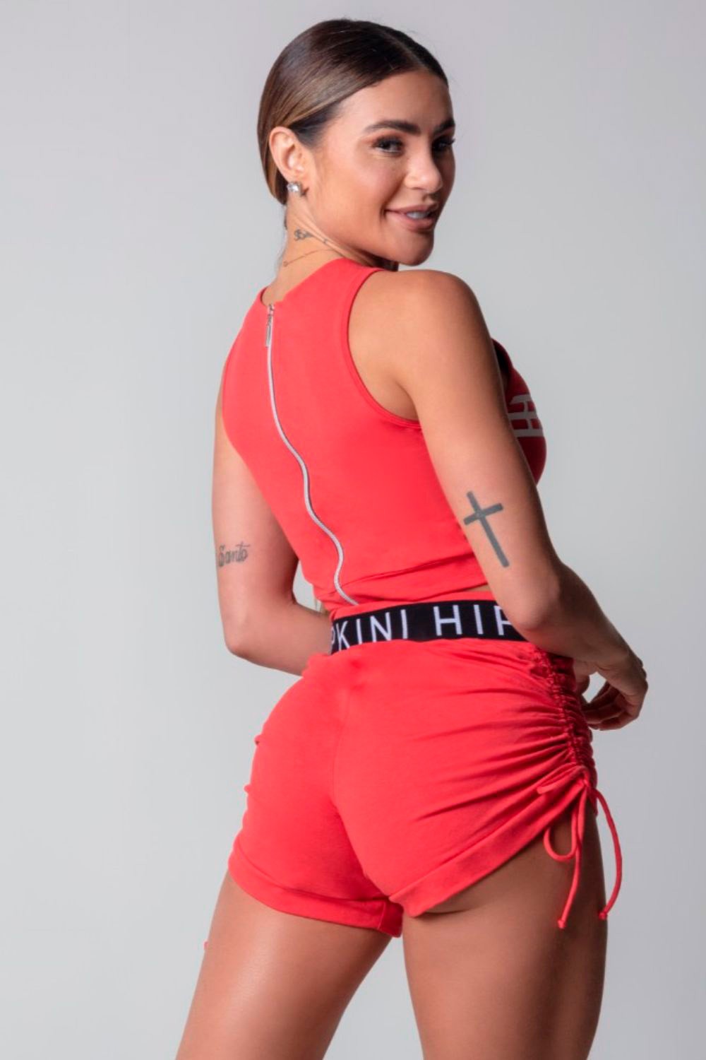 Red fitness shorts with a slim fit that flatters your figure. They feature adjustable draped sides and a custom-fitted waistband, ensuring style and security during your workout. Comfortable and modern, they're ideal for workouts or casual, sporty looks.