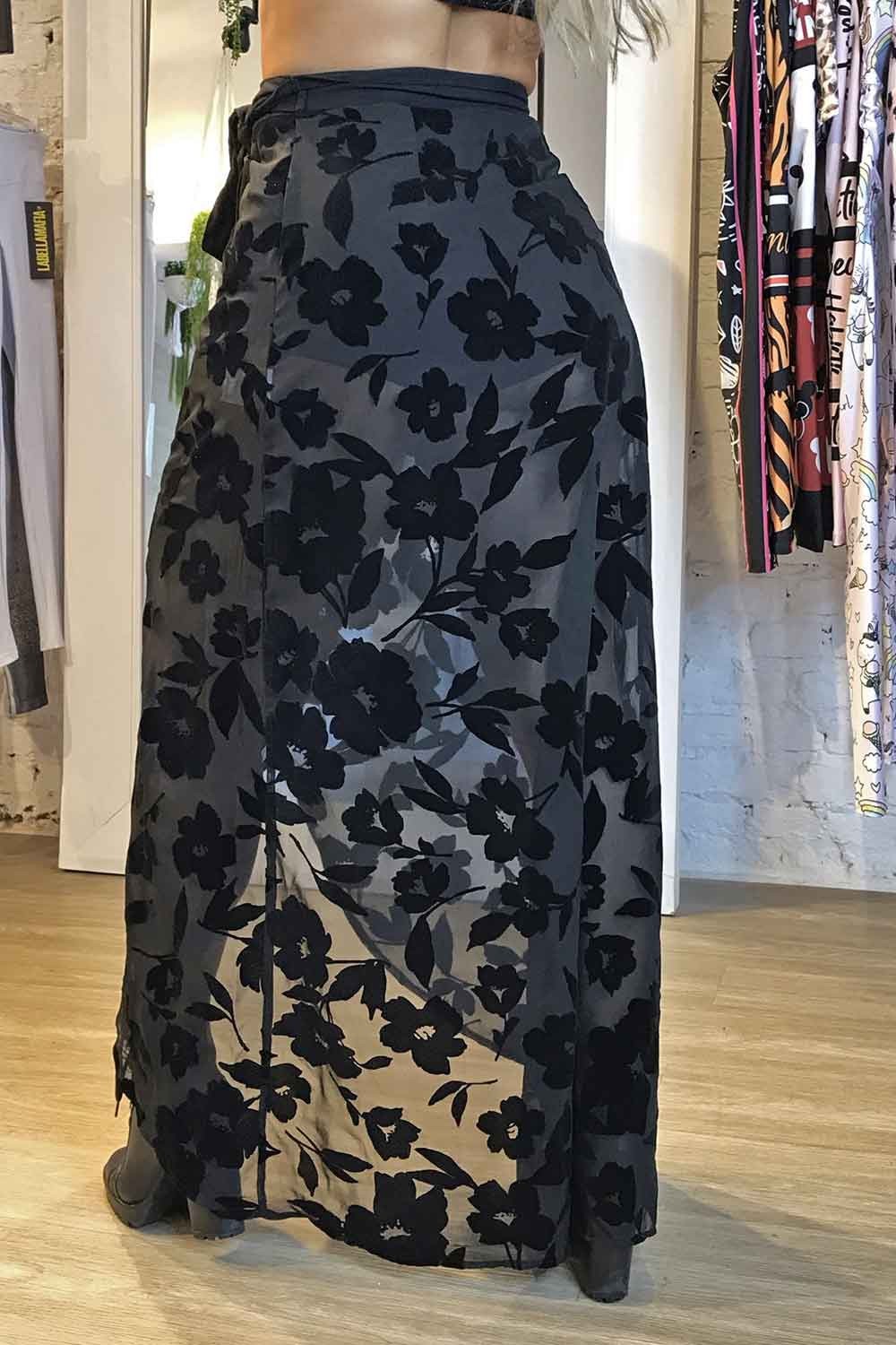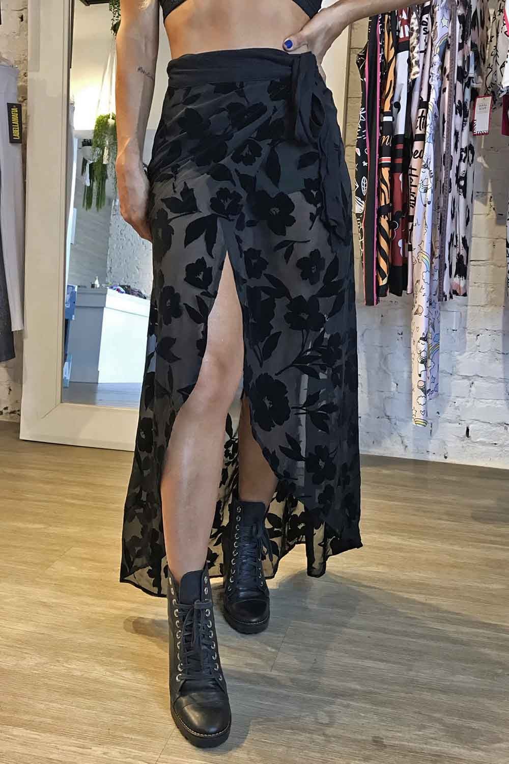 Characteristics: Midi skirt made of transparent black fabric with velvet in the flowers.