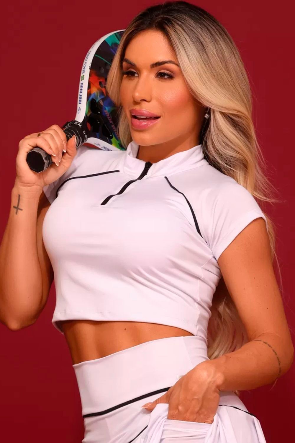 White cropped top with a front zipper. Fitted to the body, with black piping detailing for a sporty look. Ideal for creating modern and comfortable fitness looks.