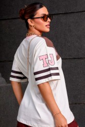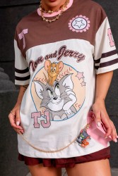 Oversized women's cotton T-shirt with a Tom & Jerry print, striped details on the sleeves, and the "TJ" logo. Comfortable and stylish, ideal for casual looks.