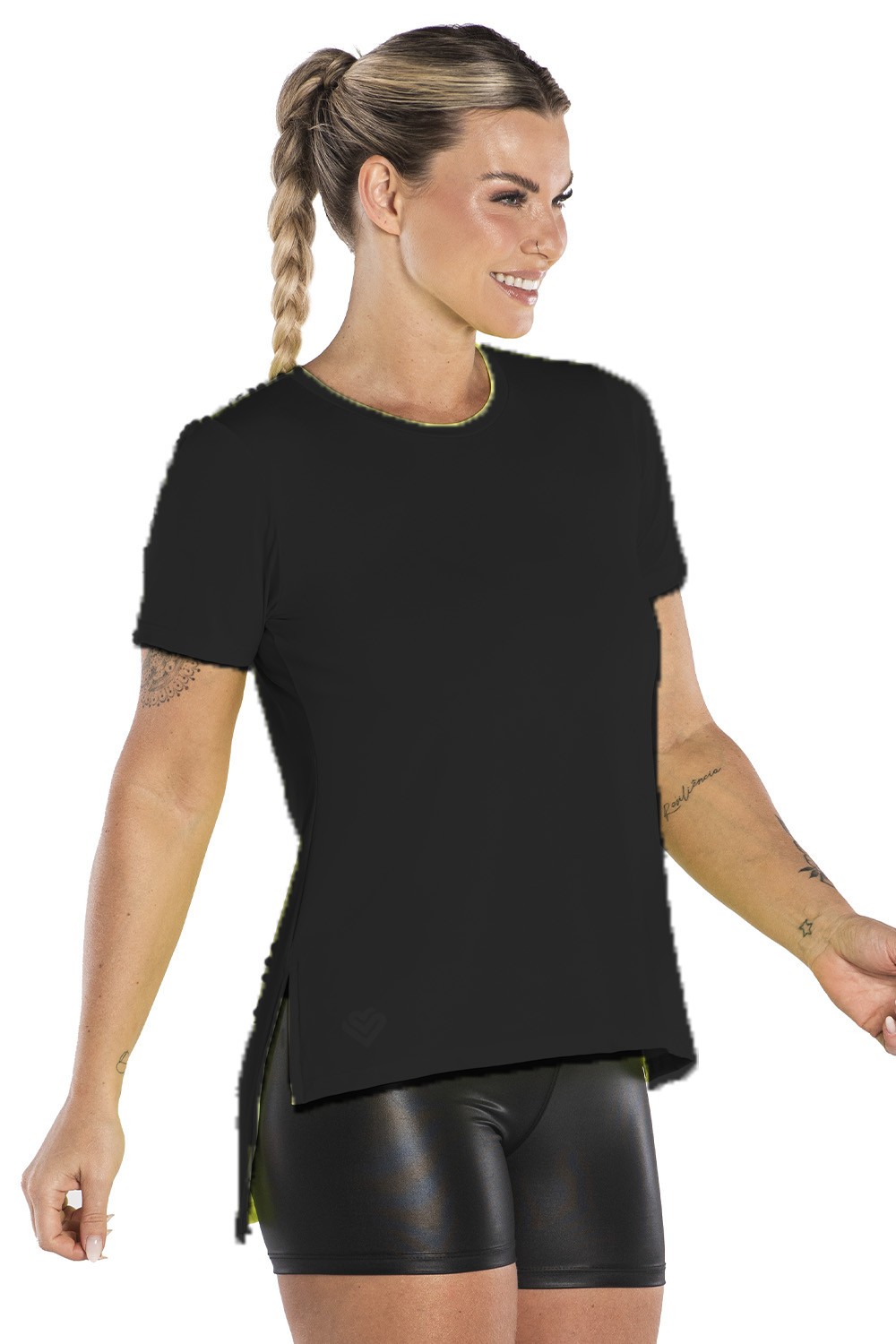 Fitness T-shirt made of super light and sporty fabric, allowing perspiration. The back with oval opening adds an extra and refreshing charm to the look. The front is plain with small slits on the sides, this is a versatile piece for any weather, being an essential in your wardrobe.