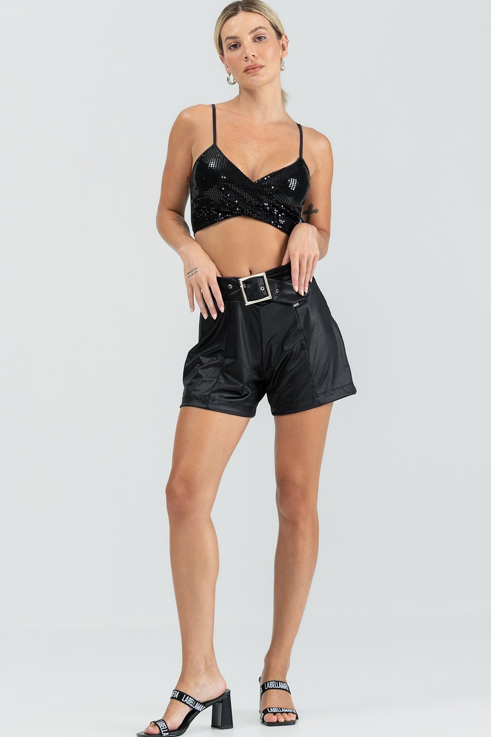 The top features an elegant and sophisticated design, with a classic black tone that is always a timeless and elegant choice. The piece is adorned with black sequins, which reflect light and create a dazzling sparkling effect. The sequins are sewn securely, ensuring they stay in place and create a flawless look.
