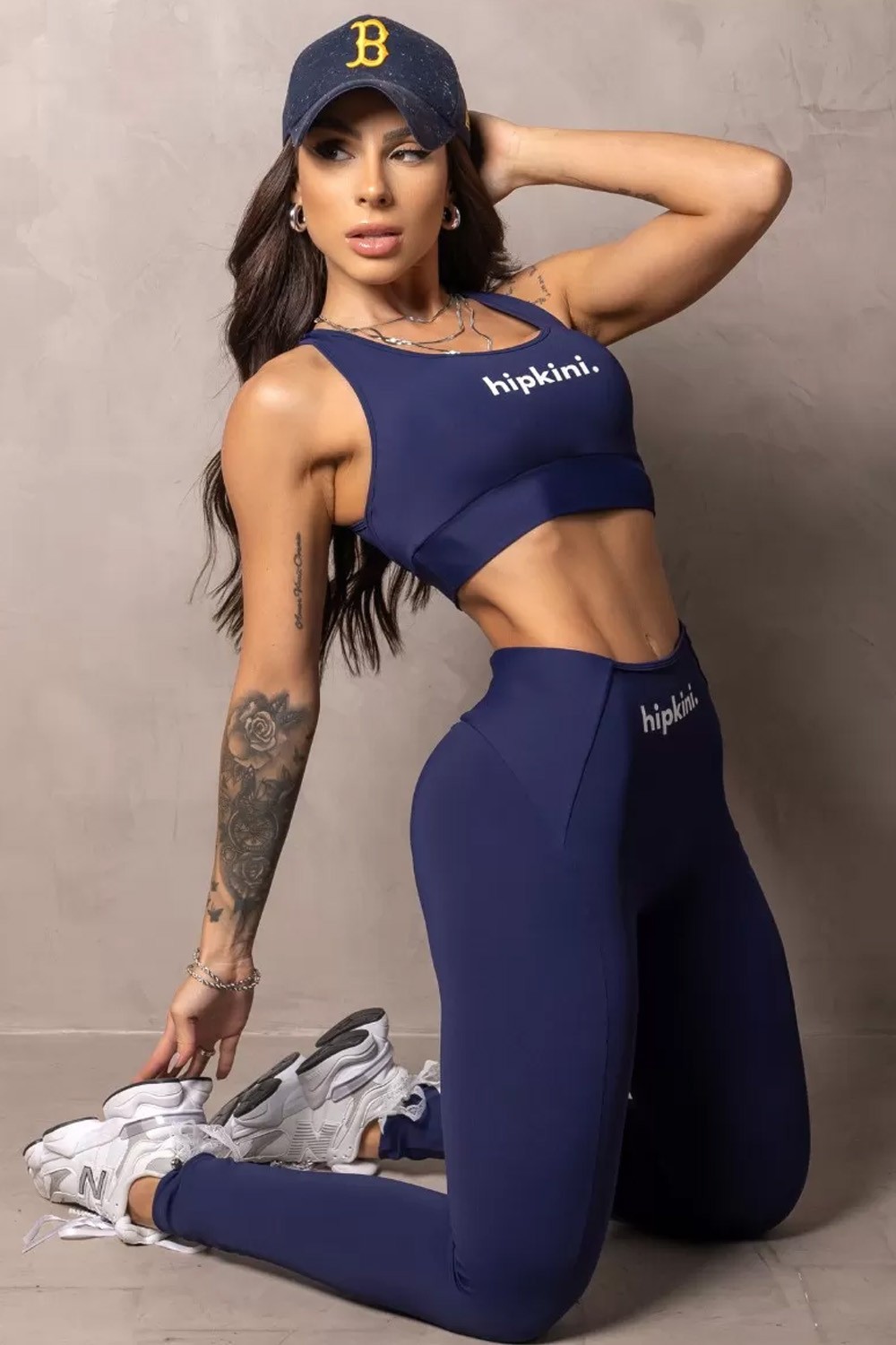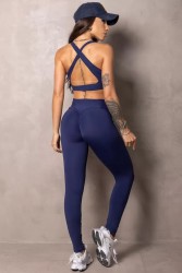 This sports bra is navy blue. It has medium straps that cross at the back and combines functionality, freshness and style, suitable for physical and casual activities. The material is elastic and comfortable, ideal for providing support during exercises. The brand logo is centered on the front, in white, adding a modern and discreet touch.