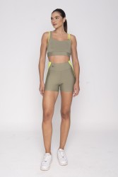 Green fitness top with neon details on the collar and straps. The straps are irregular, bringing a modern and cool look to the look and transforming it into a refined casual look.