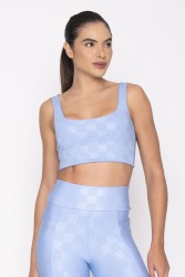 Light blue top with wide straps and a square neckline. The fabric has a subtle pattern that gives a distinctive and modern touch to the look, in addition to offering support and comfort for physical activities. The back is open and has a twisted detail that adds much more charm.