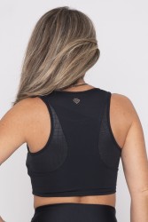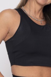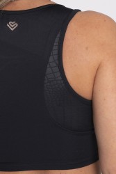 Black fitness top with racerback, ensuring comfort and support during physical activities. It has textured details on the sides, giving a modern and elegant touch to the design. Made of elastic and breathable fabric, it is perfect for workouts or casual sports outfits. Discreet and functional, it combines style and practicality.