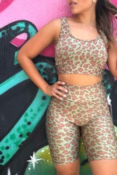 Leopard print fitness top in shades of green and brown, with medium, straight straps that ensure good support and safety for training and performing any type of physical exercise.
