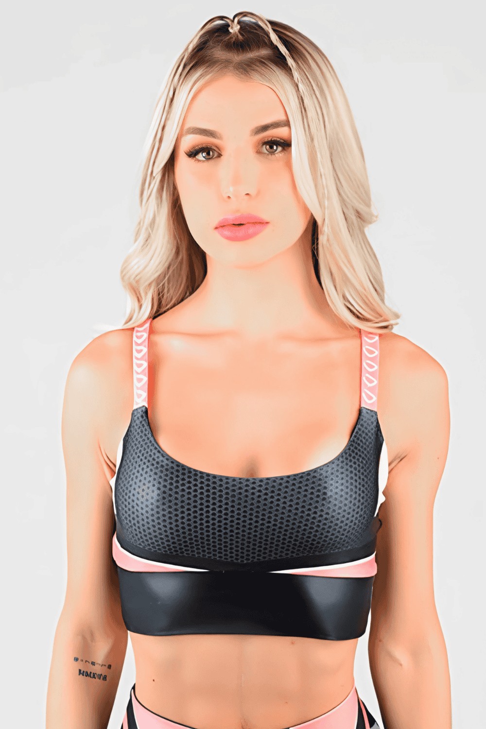 The Midnigth Blush Dynamite Fitness Top combines thin straps, comfort and style. With the "Dynamite" logo on the back, and a mix of colors and shapes on the front, it is perfect for workouts with support and style.