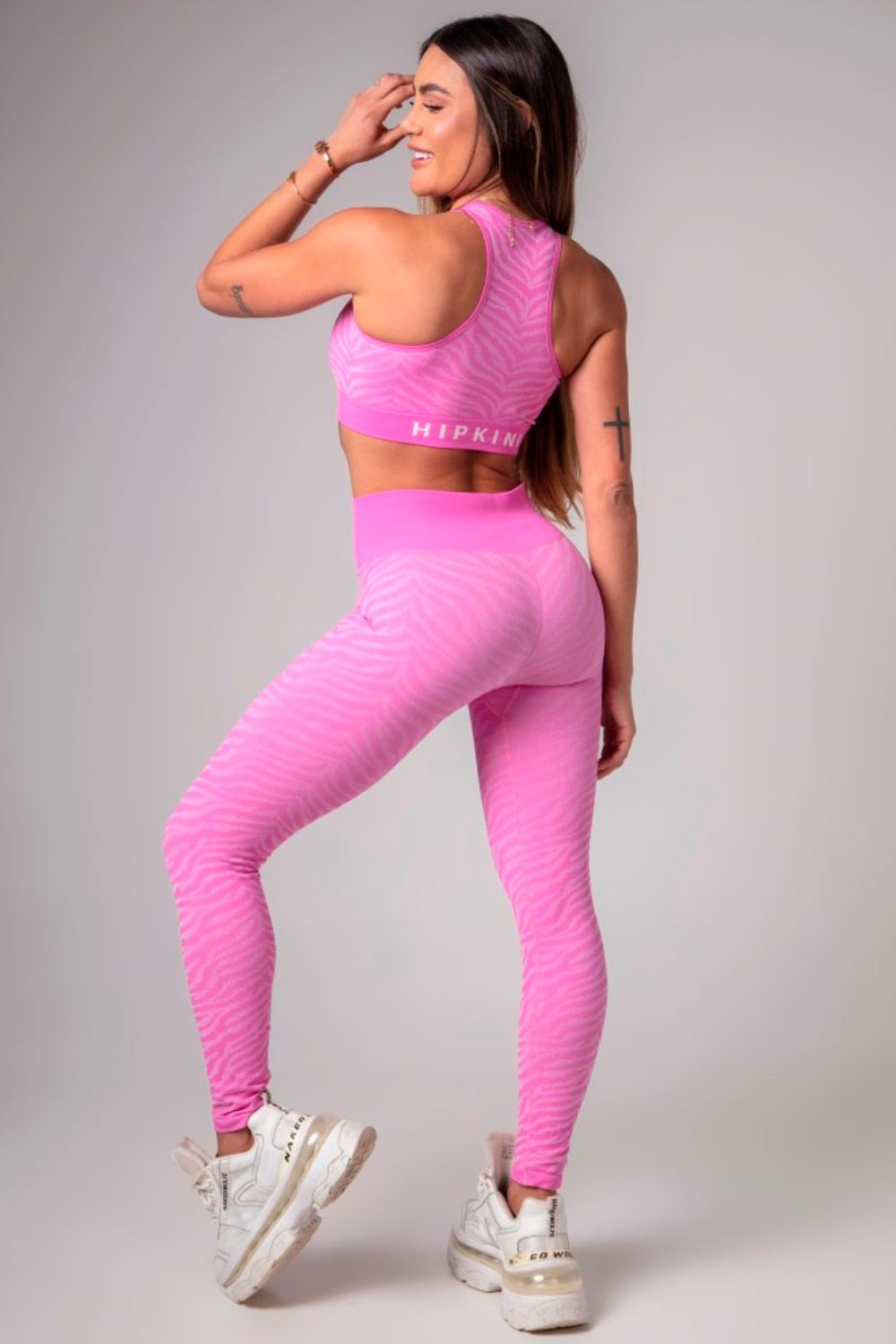 Pink sports bra with embossed animal print and openwork detailing on the bust, combining style and boldness. Made from highly stretchy ribbed fabric, it ensures a perfect fit and comfort during workouts. It features a secure waistband with the HIPKINI branding on the back, offering support and security. Ideal for creating a unique fitness look.