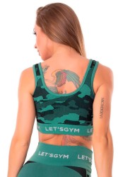 Women's fitness top with a modern camouflage print in shades of green, featuring a fitted fit that flatters the figure and provides ideal support for medium-intensity workouts. It features wide straps, a seamless finish, and a firm elastic band with the "LET'S GYM" logo, ensuring comfort and style.