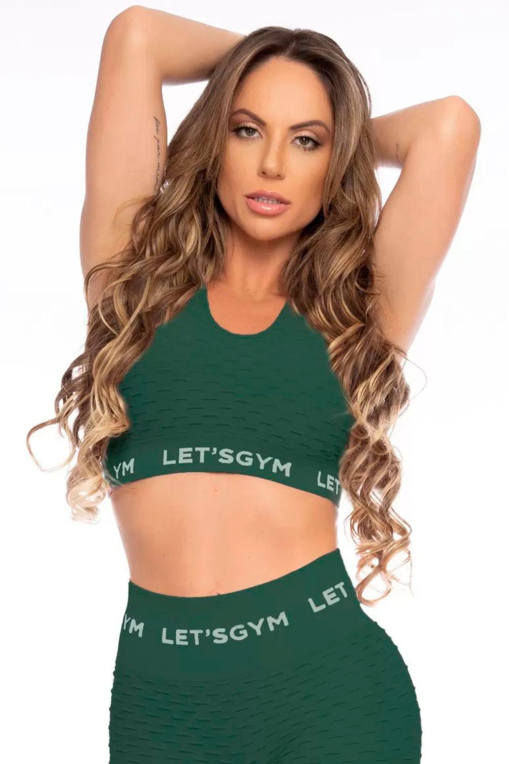 Military Green sports bra with medium support. It features brocade fabric and a custom logo elastic base, offering high compression, security, and a modern style for workouts.