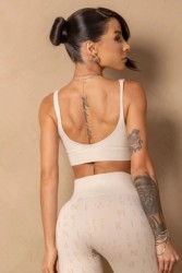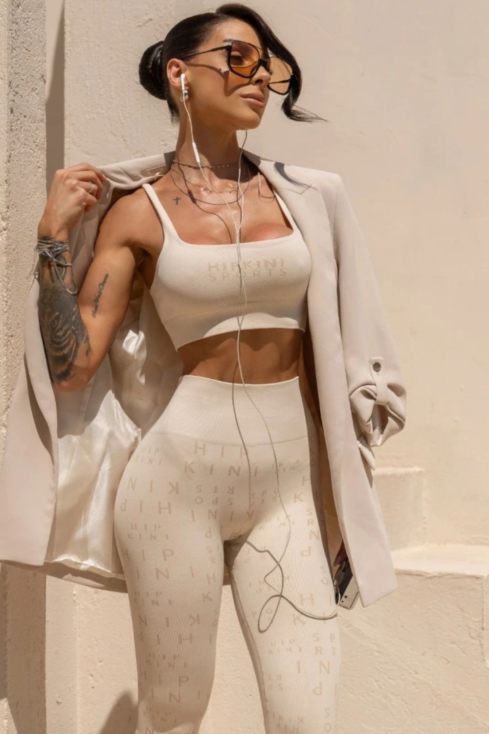 Seamless beige top with a body-hugging fit. It features an embossed "Hipkini Sports" logo on the front for a modern touch. Made from soft, stretchy fabric, it offers comfort, support, and style for workouts or casual wear.