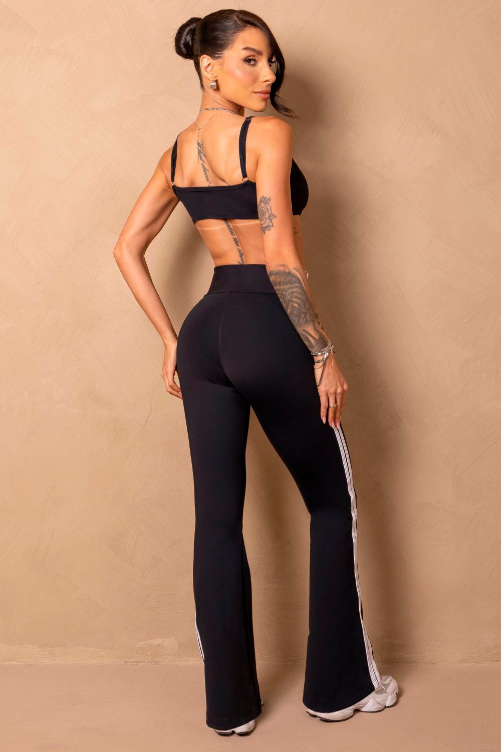 Black top with adjustable thin straps and a cutout detail on the back. It features a front logo and a fit that offers support and comfort, ideal for stylish and lightweight workouts.