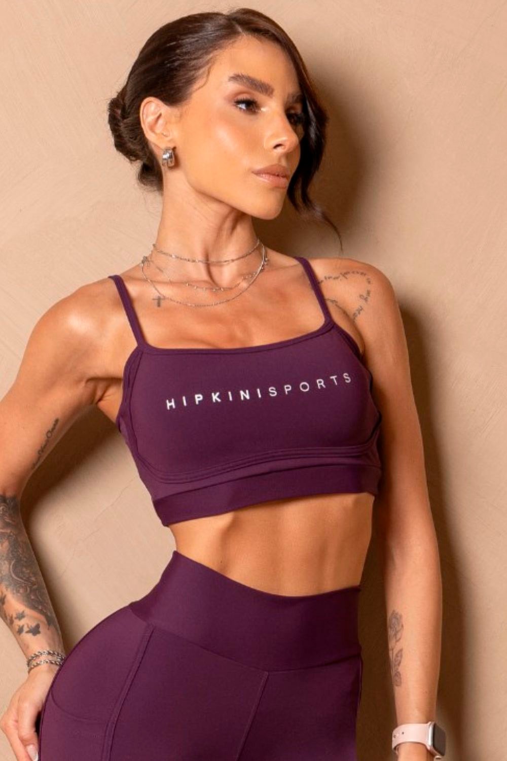 Purple fitness top with thin adjustable straps and a straight cut that enhances the bust. Made from firm and comfortable fabric, it offers light support and a soft touch, ideal for workouts or casual outfits. Features a front logo detail for a modern and sophisticated look.