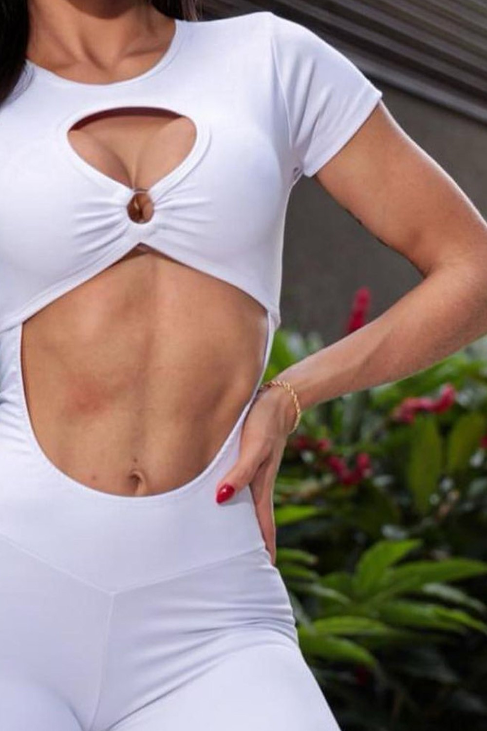 Characteristics: A white short sleeved fitness jumpsuit with a decorative opening over and underneath the bust, as well as an open back design.