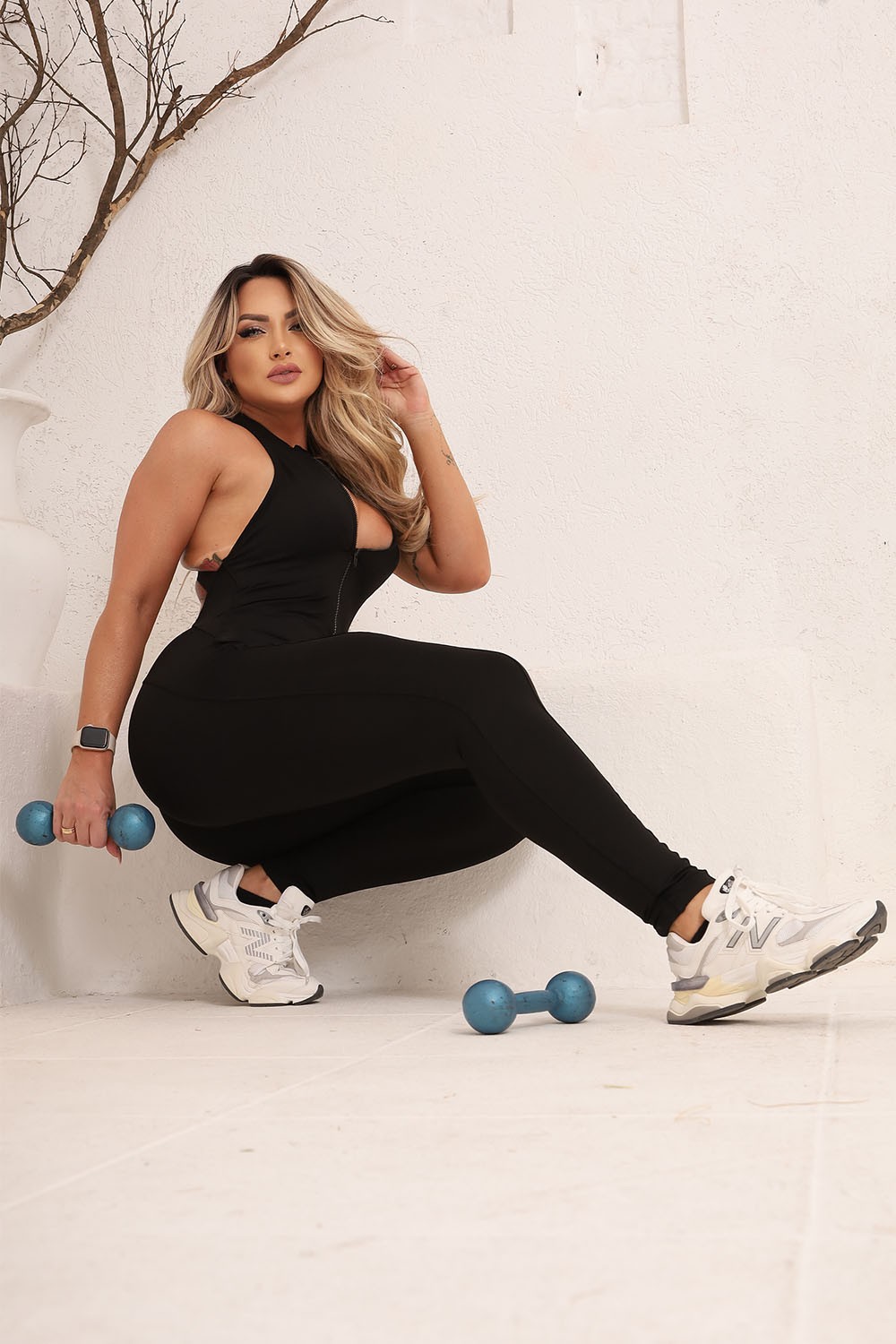 Features: Black fitness jumpsuit without sleeves, thick straps, open back and front zipper under the neckline.