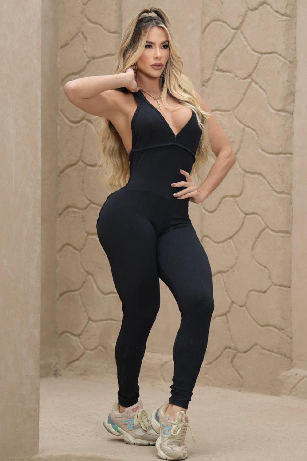 The fitted ribbed knit jumpsuit in black features a halter neckline and open back. The piece shapes the body, highlighting the silhouette.