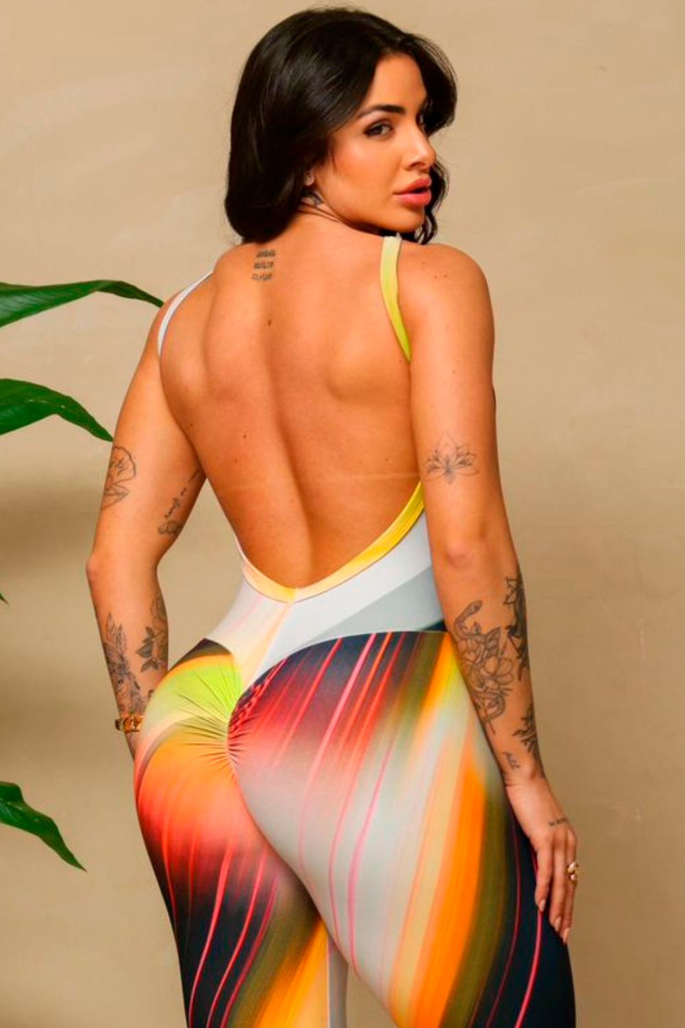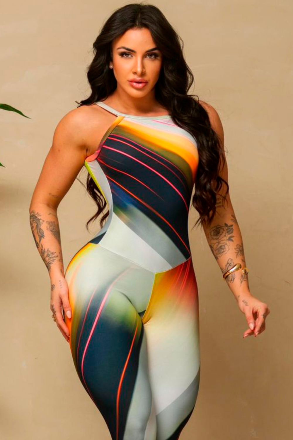 Exclusive design fitness jumpsuit with a multicolored gradient print that flatters the silhouette and elongates the body. Features a fitted design, highly elastic fabric, and excellent compression, ensuring comfort and support. Highlights include the open neckline and back, which bring modernity and sophistication to the look, ideal for workouts or elegant fitness outfits.