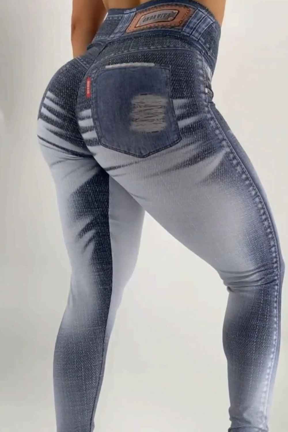 Features: Leggings with print that mimics jeans. Flexible, Malleable, Comfort, Unique Look. Waistband modeling the body. "Punches Butt" effect.
