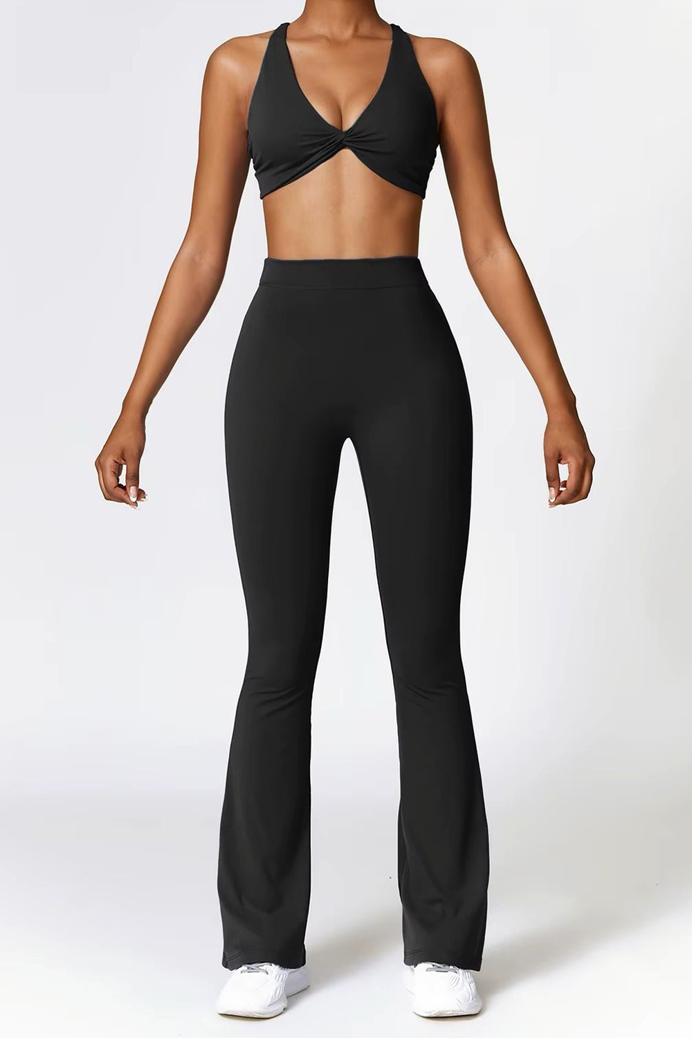 Sports set with a top with crossed straps and twisted detail on the bust, combining support and style. The high-waisted pants shape the body, with a gathered detail on the back and flared hem for an elegant touch. Perfect for workouts and casual looks!