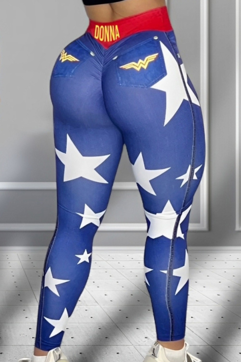 The shorts are inspired by Wonder Woman's uniform, with a predominantly blue design adorned with evenly distributed white stars, referencing the character's iconic style. The waist is high and in vibrant red, bringing a touch of contrast, while the tight fit enhances the shape and reflects the classic superhero style. CONTAINS BUTT LIFT in the shorts, which highlights the curves.