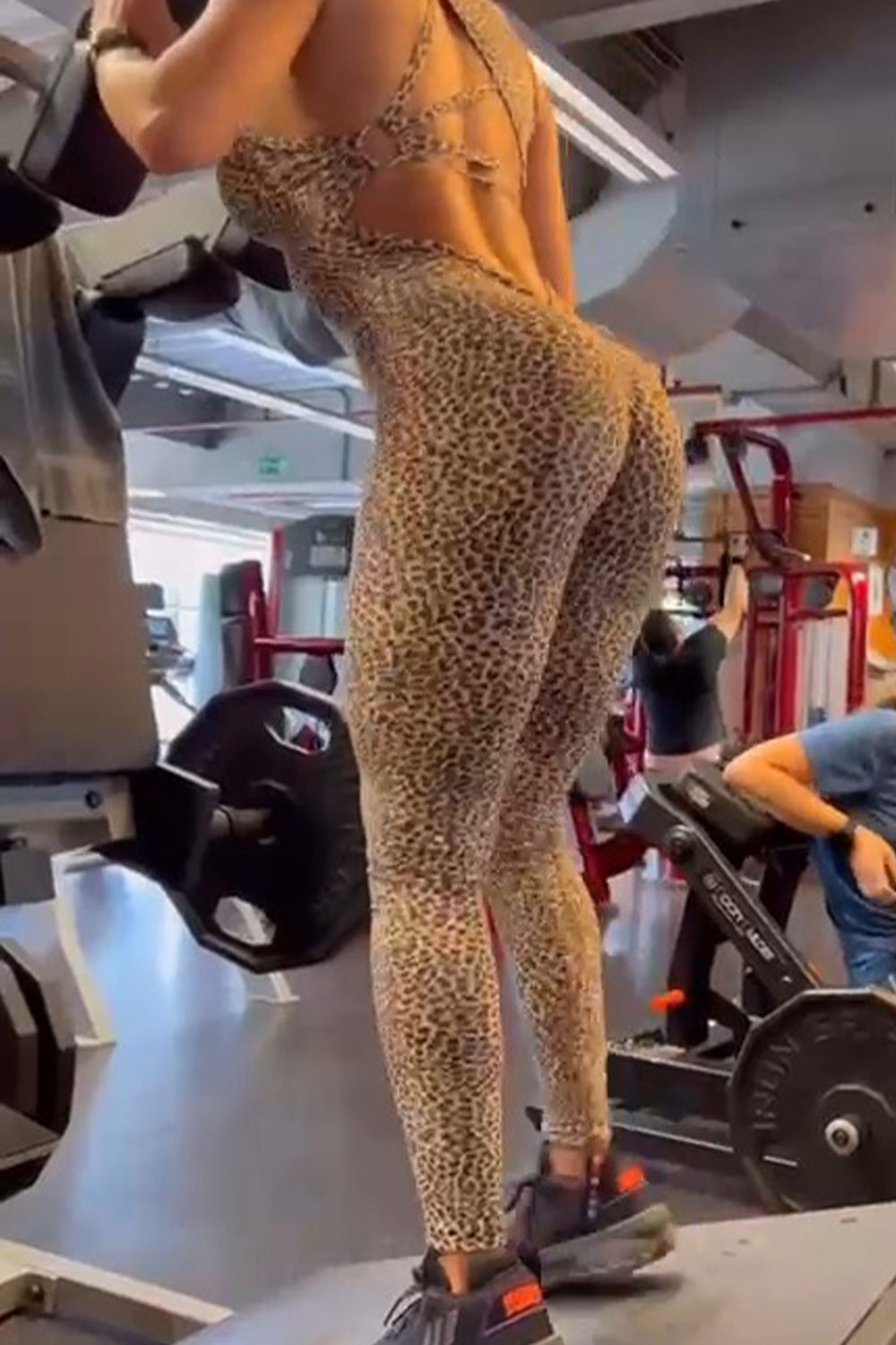 Introducing our fierce fitness jumpsuit - the perfect blend of style and strength with a dash of wild! Crafted from a striking animal print fabric, this jumpsuit is designed to make you stand out. What sets it apart are the asymmetric straps that elegantly overlay on the back, adding a dynamic and fashionable twist to your workout attire.