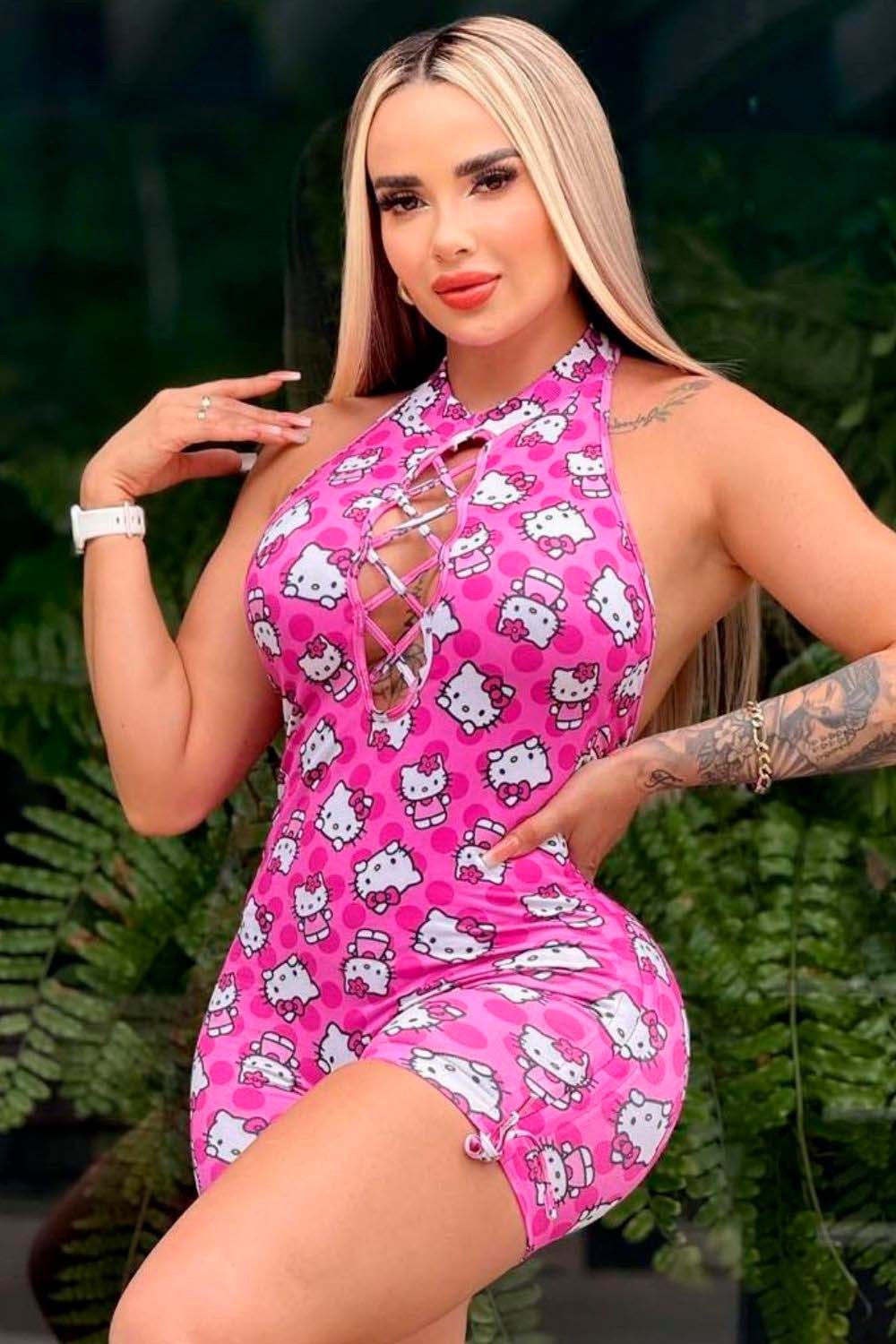 Hello Kitty print romper, made of lightweight, form-fitting fabric. It features a braided neckline and an open back, combining comfort and sensuality in a modern and fun piece.