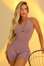 This romper is made from a form-fitting, stretchy fabric that shapes the silhouette. It features a V-neck with discreet ruching at the bust and thin straps that cross at the back, leaving the back almost completely open. The waist is accentuated by the design itself, which elongates and flatters the body shape, creating a minimalist and sophisticated look.