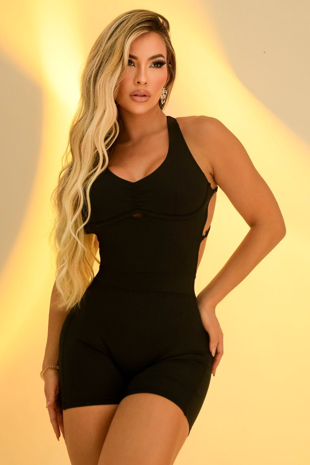 This romper is made from a form-fitting, stretchy fabric that shapes the silhouette. It features a V-neck with discreet ruching at the bust and thin straps that cross at the back, leaving the back almost completely open. The waist is accentuated by the design itself, which elongates and flatters the body shape, creating a minimalist and sophisticated look.